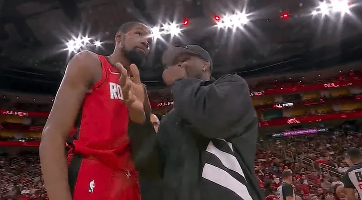 第三节比赛,爱德华兹今日因伤休战,暂停期间和杜兰特开心交流。