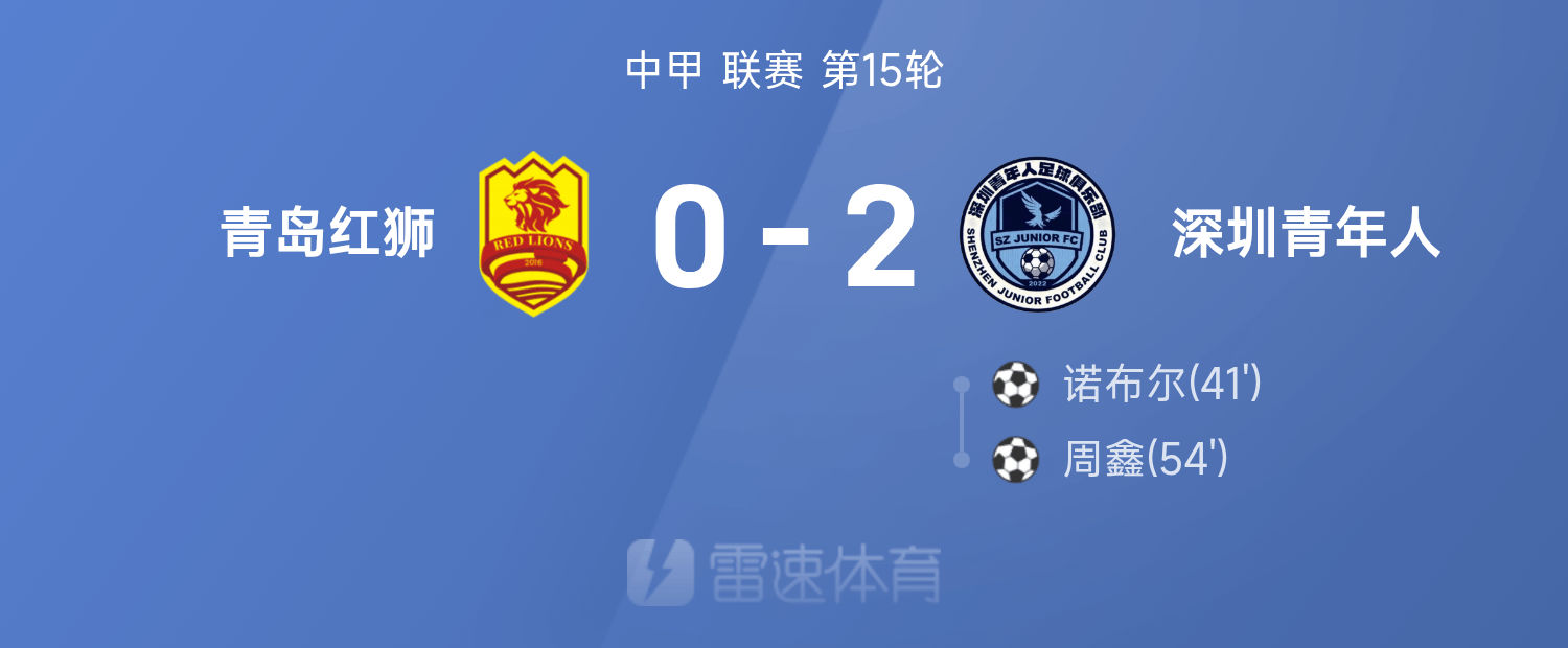 07月05日讯 25赛季中甲联赛第15轮,深圳青年人2-0战胜青岛红狮。全场比赛,诺布尔、周鑫破门建功。