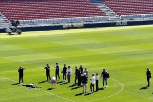 本周五,一张颇具超现实意味的照片在网络上流传开来。照片中,俱乐部主席拉波尔塔仰面躺在球场中央的草坪上。旁边还有几位摄影师和一位负责俱乐部社交媒体的工作人员,这可能是为了宣传球队在获得相应区域开放许可后重返主场的活动。